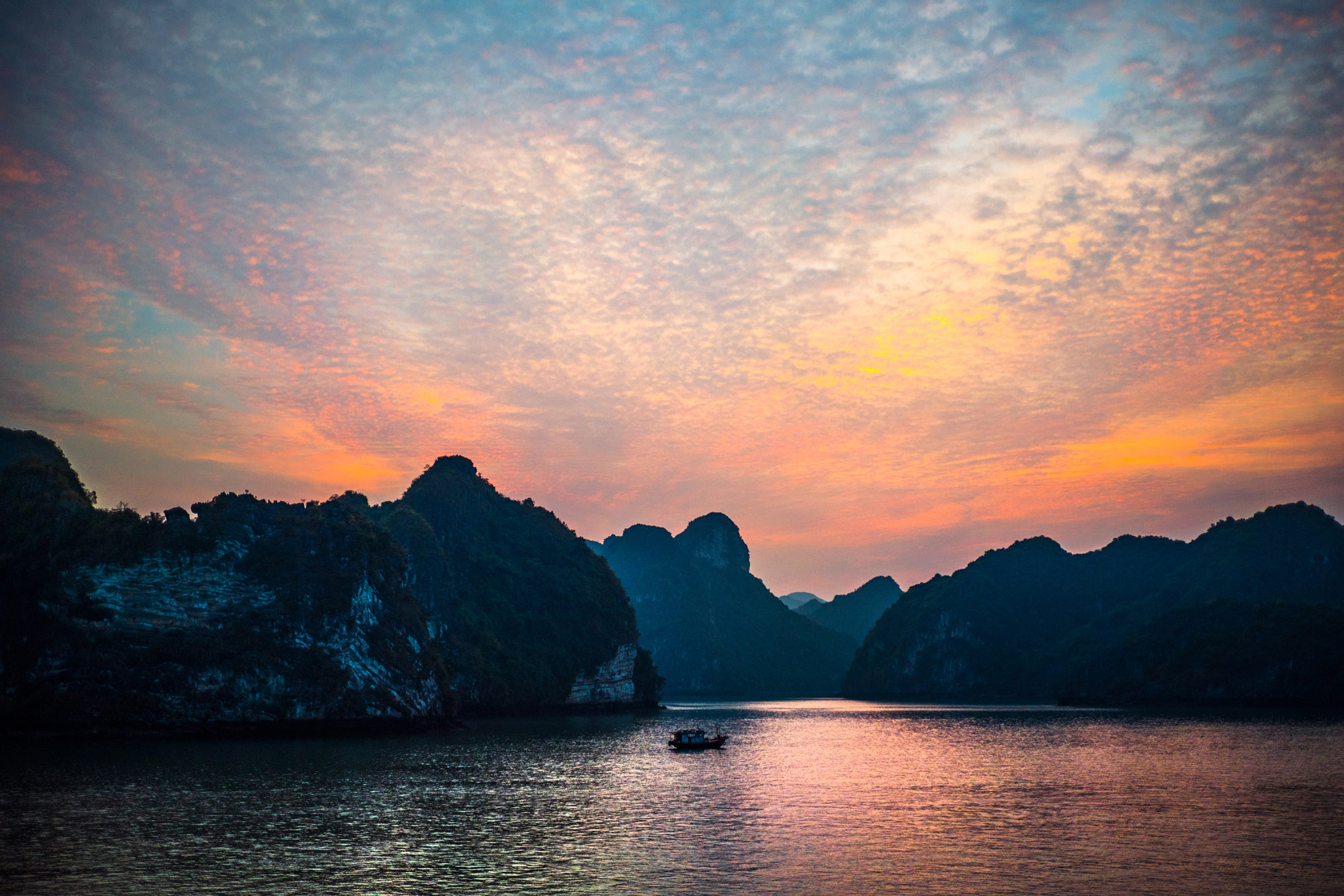 - Ha Long Bay’s limestone karsts rising out of calm water